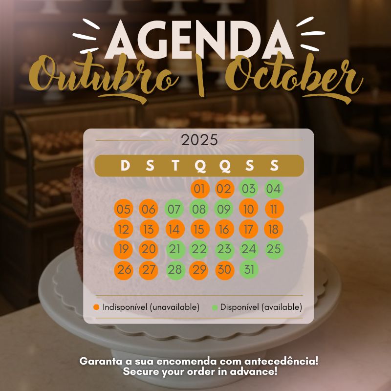 A nossa produção é artesanal e com vagas limitadas por data, por isso as encomendas estão sujeitas à disponibilidade indicada no calendário abaixo.
