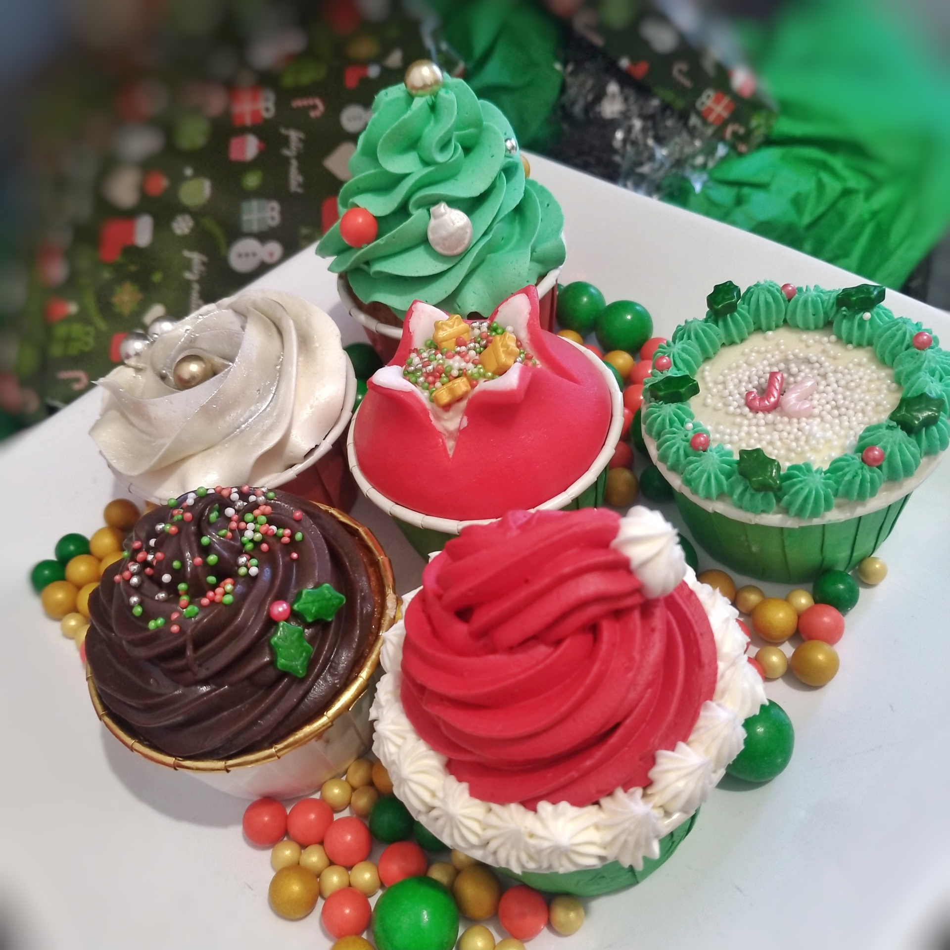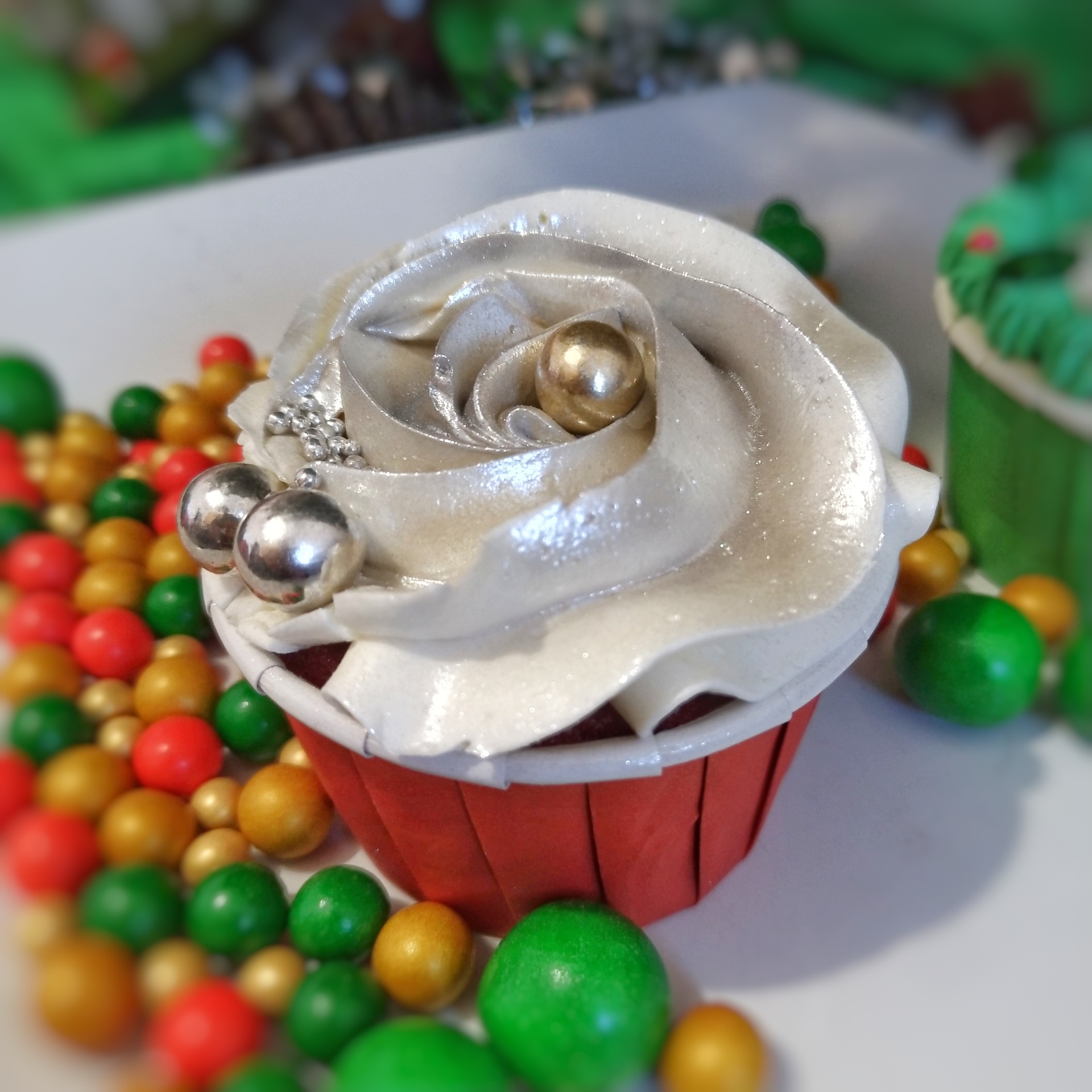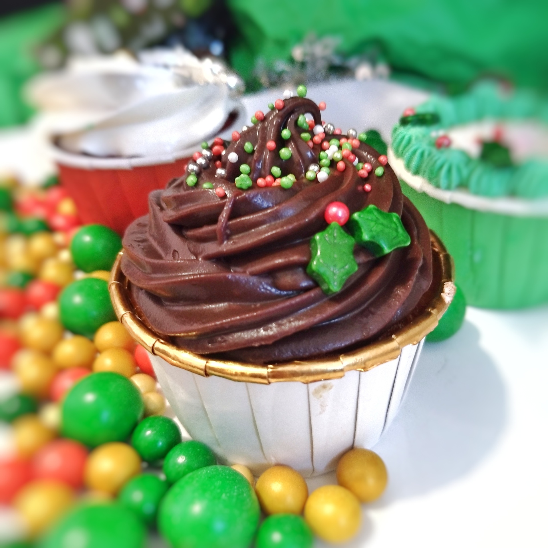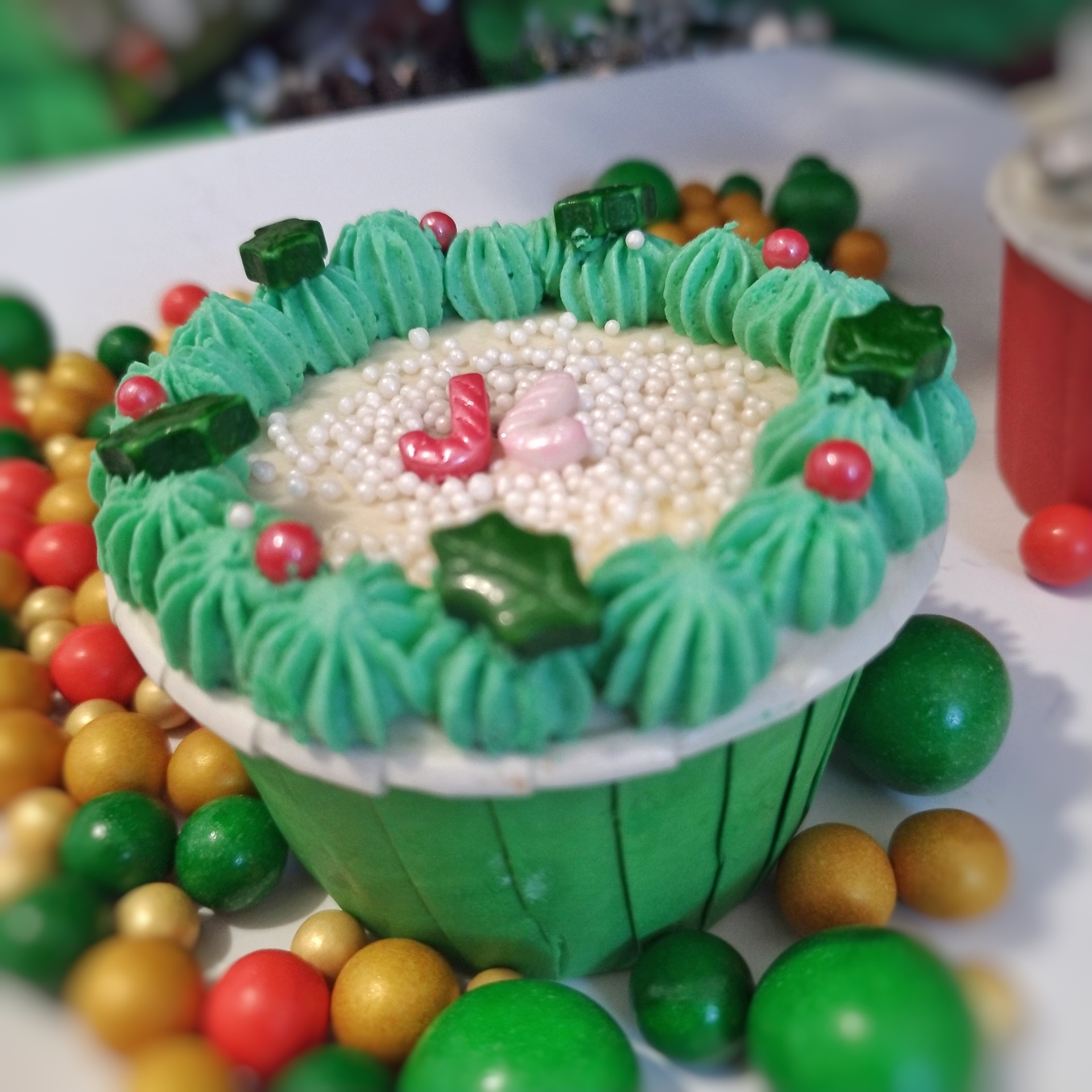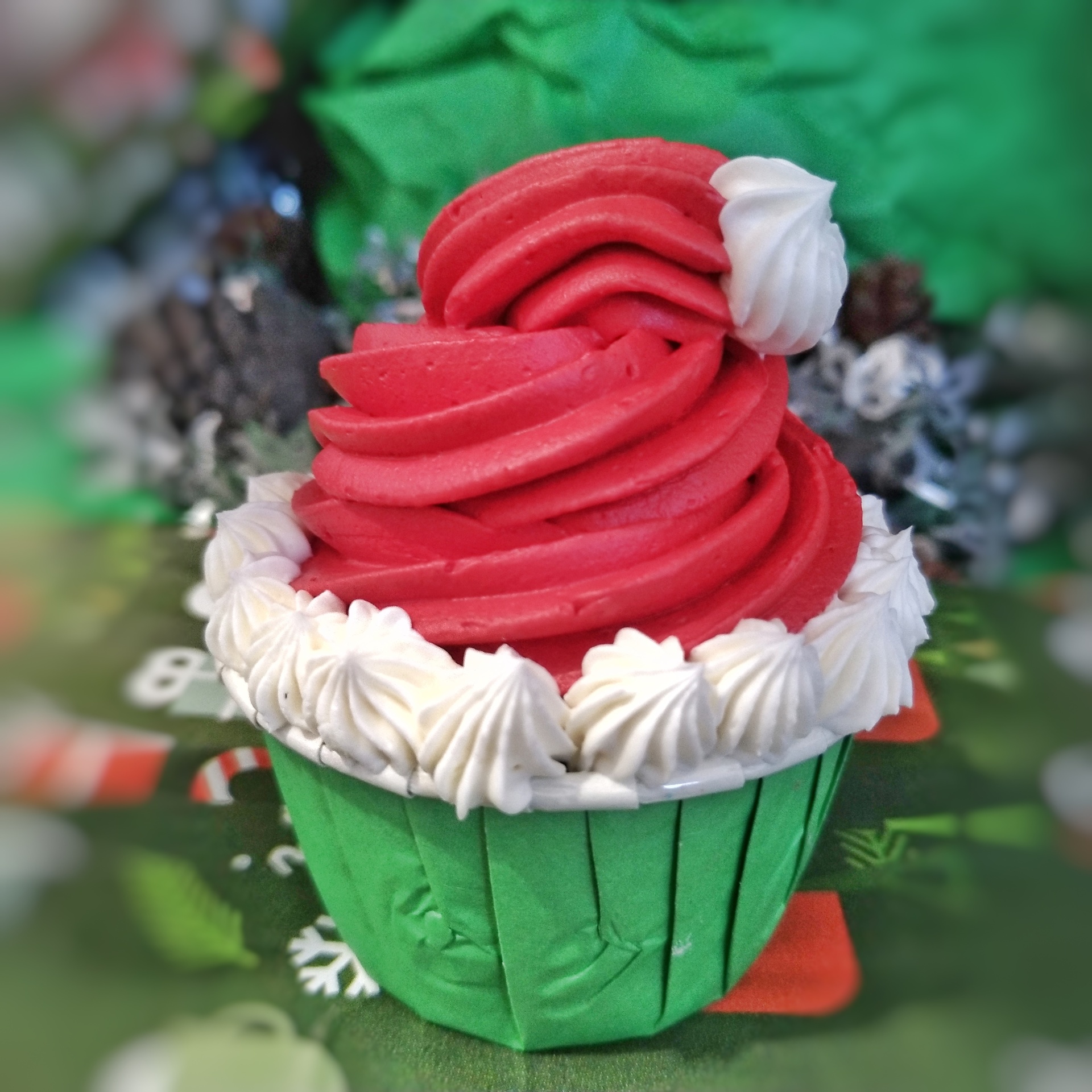 • Cupcake decorativo verde com cobertura vermelha e branca em ambiente festivo