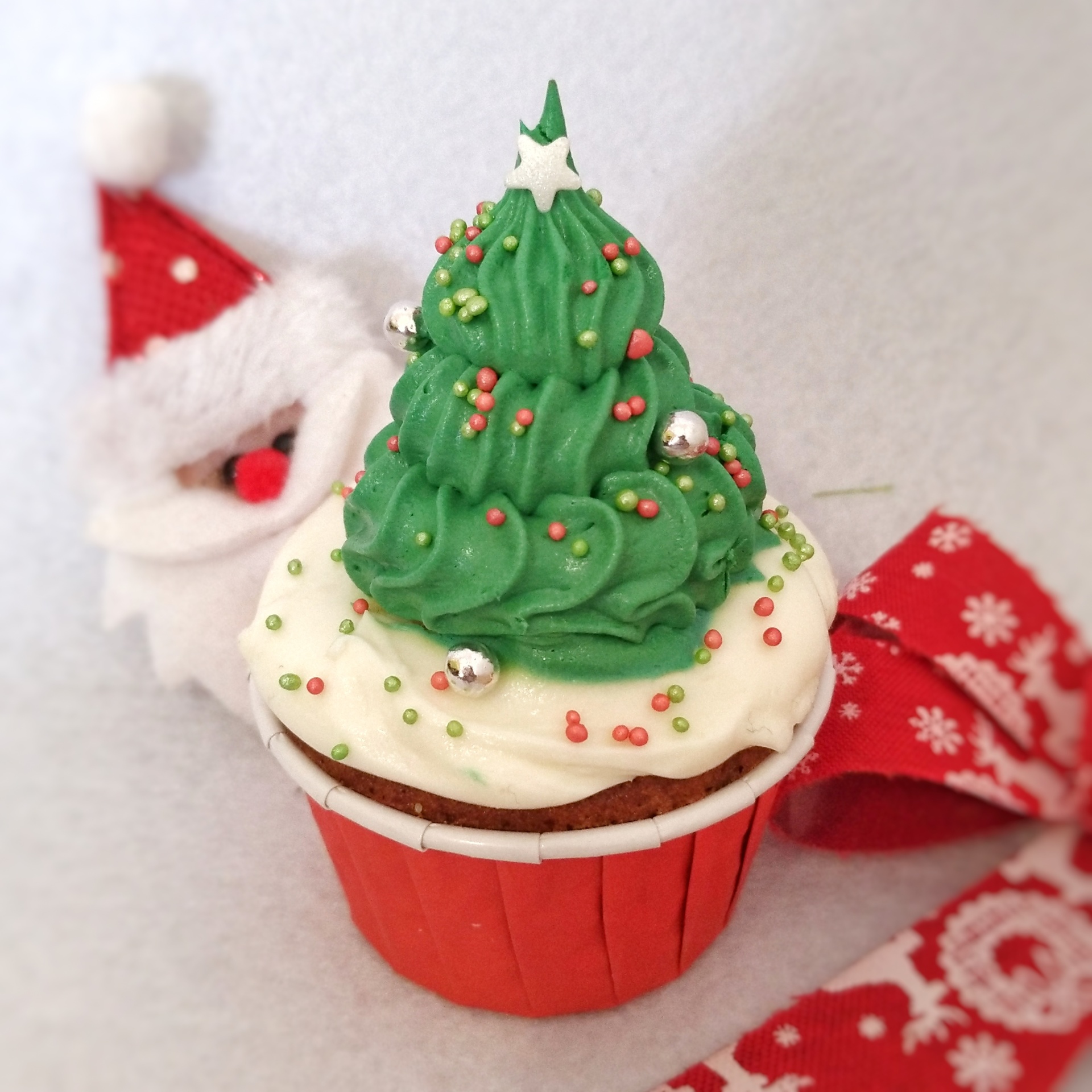 • Cupcake decorado com tema de árvore de Natal, embalagem vermelha e pano natalício ao fundo