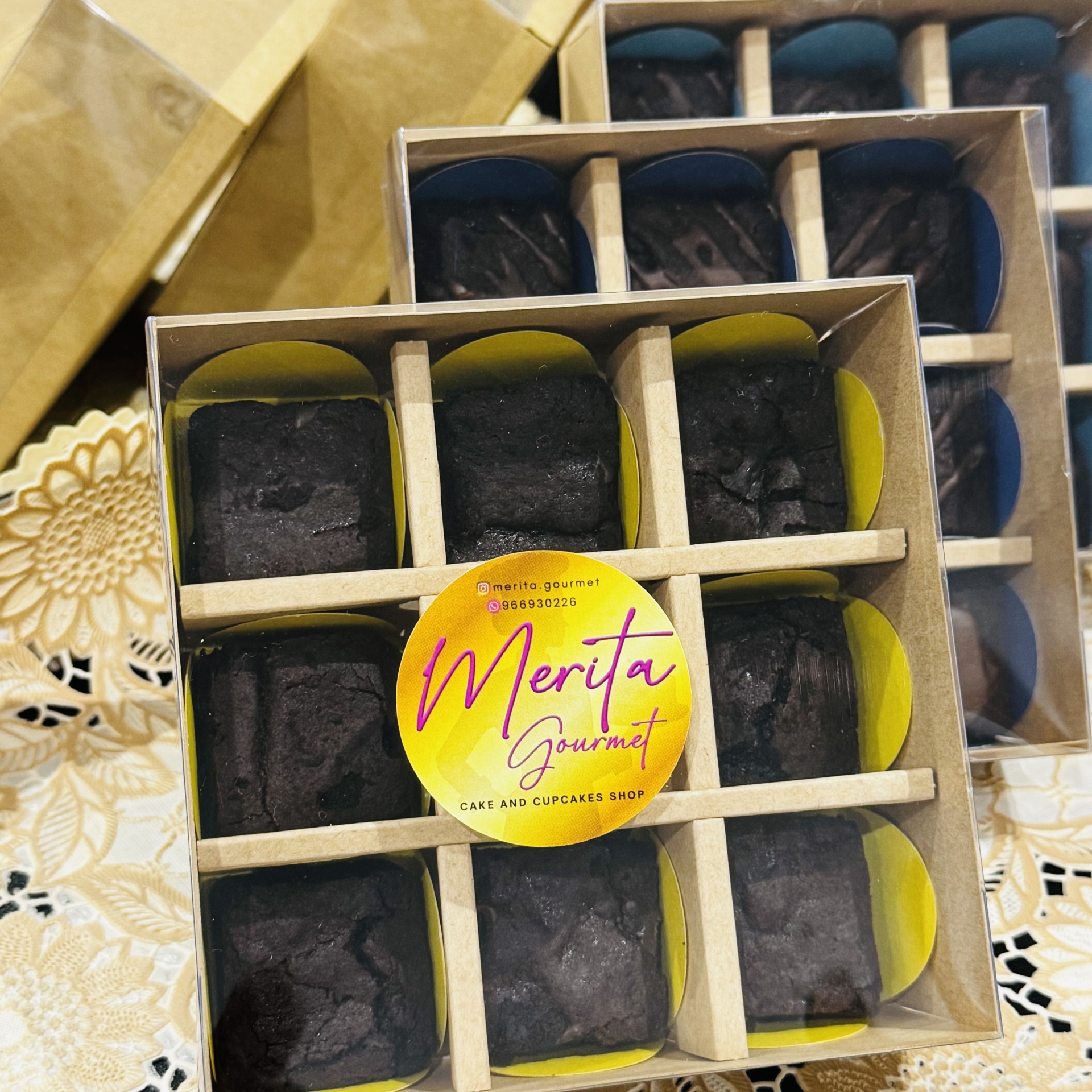 • Caixas de madeira com pequenos bolos escuros e etiqueta Merita Gourmet sobre tecido bordado.